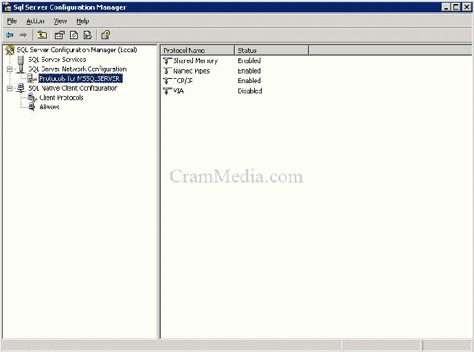 サーバーで現在有効になっているネットワークプロトコルを表示するには、SQL Server 構成マネージャを開き、[SQL Server ネットワークの構成] を展開します。次の図のように、4 種類のプロトコルとその状態が表示されます。