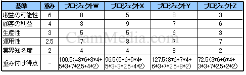 解説: 重み付け得点モデルでは、得点モデルに用いる判断基準の重要性に基づいて、それぞれの基準に重み付けがされます。 各プロジェクトに、既定されたスケールに基づき、それぞれの基準に対する評価をつけます。 その際、より高い評価は、会社にとって望ましい効果をもたらすことを意味します。 それぞれの基準で、プロジェクトの評価に重み付けを掛け、すべてを足したものが総合値となります。 総合値がもっとも高いプロジェクトが、会社にとって望ましいプロジェクトと考えられます。